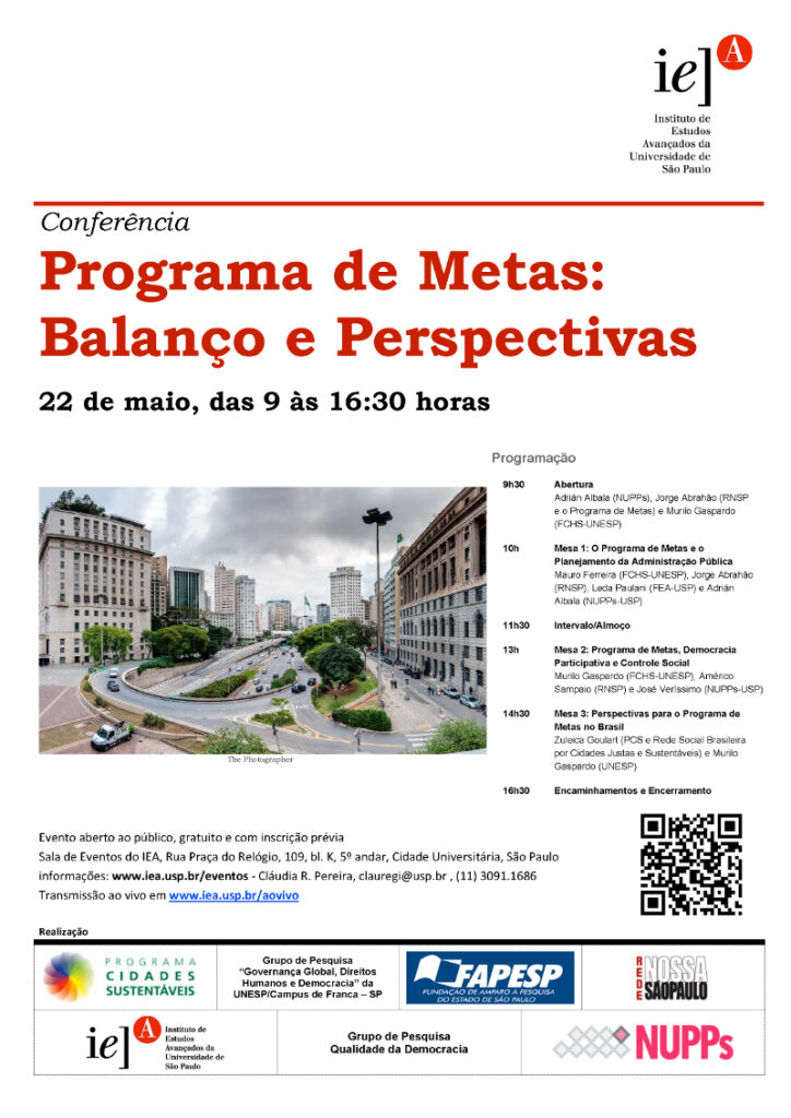 Da Assessoria de Comunicação do IEA – Institutos de Estudos Avançados da USP Os resultados obtidos com a adoção do Programa de Metas pela cidade de São Paulo e os fatores que os explicam serão analisados no seminário Programa de Metas: Balanço e Perspectivas, na próxima segunda-feira (22/5), das 9 às 17 horas, na Sala […]