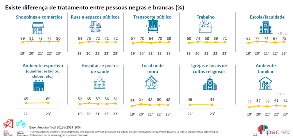 Os números permanecem estáveis na comparação com as pesquisas dos últimos anos, mas cresceram significativamente em relação ao levantamento de 2019. Naquele ano, 69% dos entrevistados diziam haver diferença no tratamento entre negros e brancos nos shoppings e no comércio em geral; 64%, nas ruas e espaços públicos; 62%, nas escolas e faculdades; e 60%, no ambiente de trabalho.