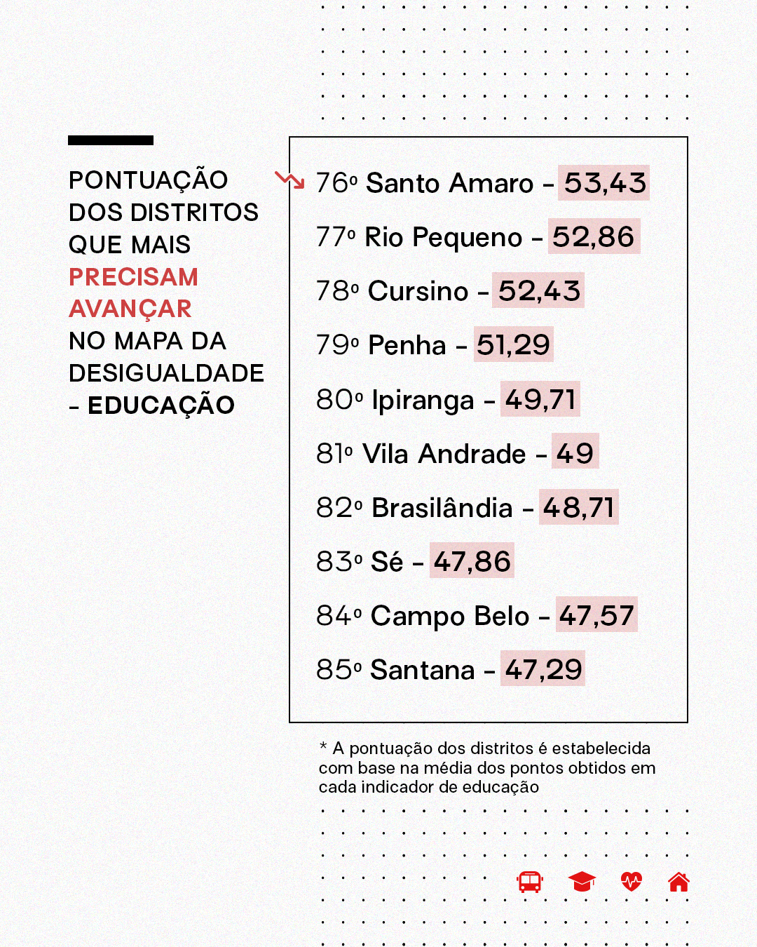 O Mapa da Desigualdade traz também o ranking temático de educação, que apresenta a classificação dos 85 entre os 96 distritos da cidade na área. A lista considera as regiões que possuem educação municipal e o desempenho de cada distrito em cada indicador, de modo que se obtenha uma pontuação geral no tema. No topo, aparecem Perdizes, Artur Alvim e Butantã. Na outra ponta, estão Sé, Campo Belo e Santana.