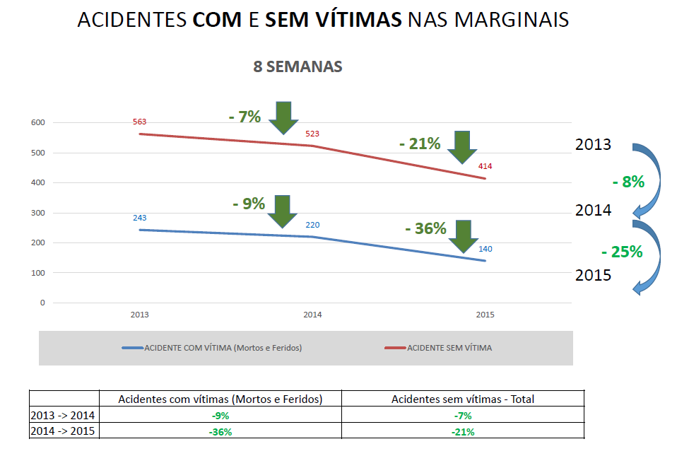 O relatório elaborado pela CET apontou também uma queda de 21% no número de acidentes sem vítimas nas Marginais Tietê e Pinheiros, que passaram de 523 para 414 ocorrências nas oito semanas analisadas, na comparação com o mesmo período de 2014.
