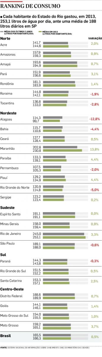 Levantamento mostra que morador do Rio gastou, em média, 329,78 litros por dia em 2013, ante 188,03 do consumidor de