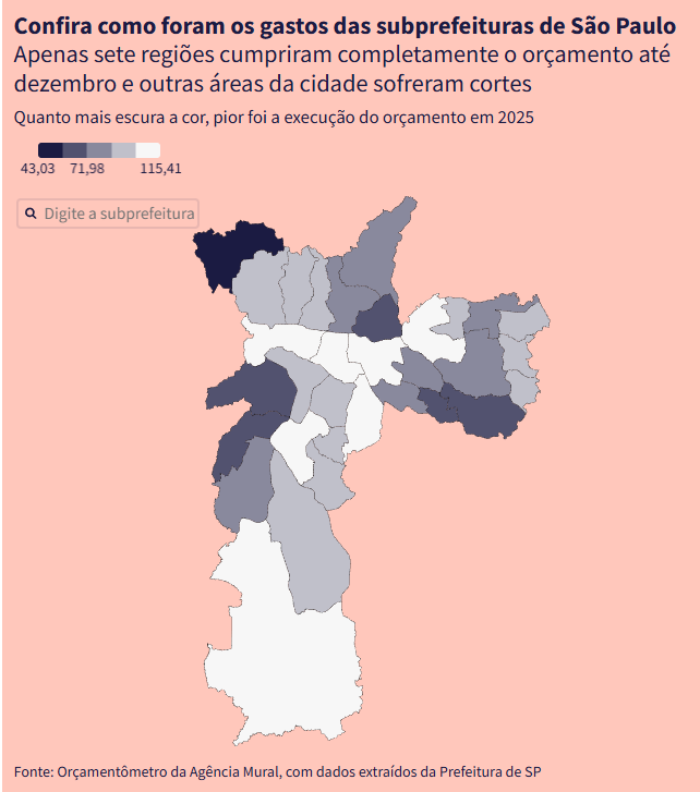 Levantamento da Agência Mural de Jornalismo, ao analisar o orçamento de 2025, mostrou outro ponto crítico: as subprefeituras localizadas em áreas mais vulneráveis foram justamente as que menos conseguiram executar o orçamento previsto.