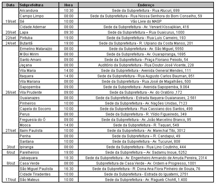 No sábado (19), serão três audiências públicas nas subprefeituras de Aricanduva (zona leste), Campo Limpo (zona sul) e Sé (centro). Esta última será realizada no Vão Livre do Museu de Arte de São Paulo (MASP), a partir das 10h, para debater a abertura da avenida Paulista. No domingo (20), serão mais duas audiências nas regiões da Cidade Ademar (zona sul) e Lapa (zona oeste). Os encontros, que têm o Ministério Público Estadual como convidado, acontecerão até serem encerrados no dia 17 de outubro, em São Mateus, São Miguel Paulista e Cidade Tiradentes, todos na zona leste. Confira abaixo a programação das discussões.