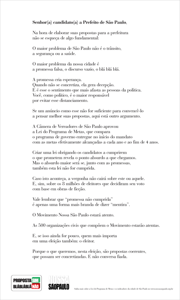 A campanha que tem como slogan a frase “Proposta sim, blá, blá, blá não” foi criada e planejada pela agência de publicidade Lew Lara. O anúncio já publicado em alguns jornais nesta segunda-feira (21/07) tem um formato de carta aos candidatos e ressalta o quanto as promessas não cumpridas geram decepção e afastam as pessoas da política. A peça publicitária enfatiza também que as organizações que compõem o Movimento estarão atentas para as promessas que possam ser concretizadas.