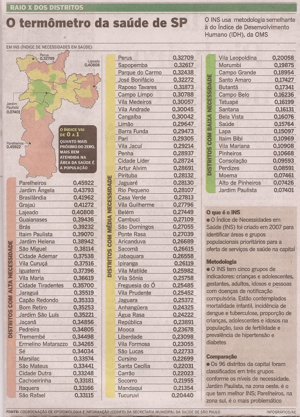 De acordo com a terceira edição do Índice de Necessidades em Saúde (INS), publicada em junho, moram em distritos com alto índice de problemas em saúde 4,9 milhões de paulistanos, ou 45% da população. Esses moradores estão distribuídos entre os 30 distritos mais problemáticos .