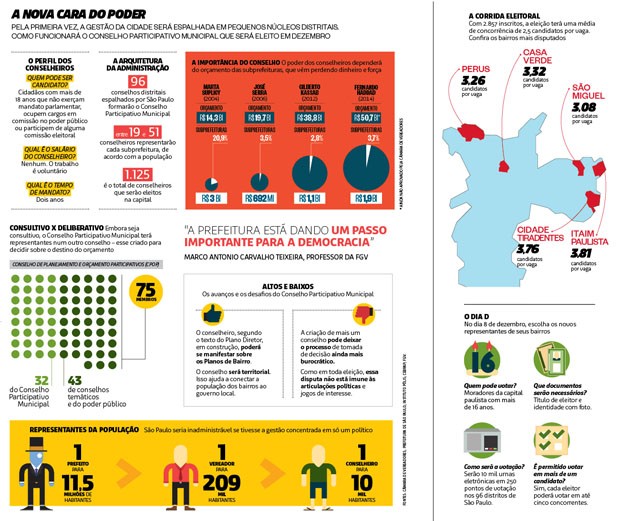 Embora não seja a mais óbvia, a mais expressiva resposta política para os milhões de paulistanos que ocuparam as ruas em protestos neste ano vai ganhar forma no próximo dia 8 de dezembro. Nessa data, a população elegerá os 1.125 integrantes do Conselho Participativo Municipal, uma nova estrutura de governança pública pensada para fiscalizar a gestão de São Paulo, apontar as prioridades locais e controlar o orçamento de cada bairro. Pode parecer só mais uma camada entre as várias que se sobrepõem na administração da cidade. Mas, ao menos em tese, o conselho permitirá a pequenos núcleos de poder influenciar as tomadas de decisão. “A prefeitura está dando um passo importante para o adensamento da democracia na cidade”, afirma o cientista político Marco Antonio Carvalho Teixeira, professor da Fundação Getulio Vargas.