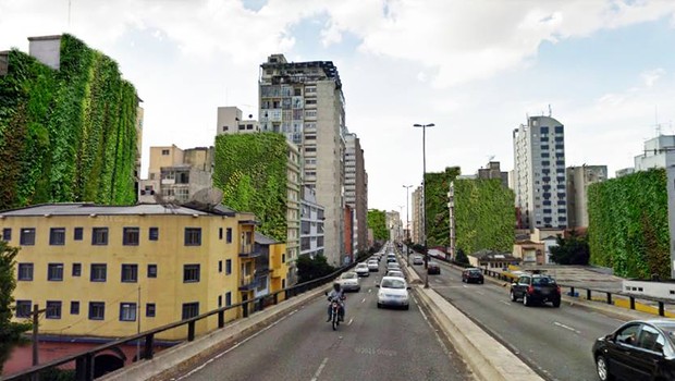 Projeção da região do Minhocão com vários jardins verticais. (Foto: Movimento 90º/ Divulgação)