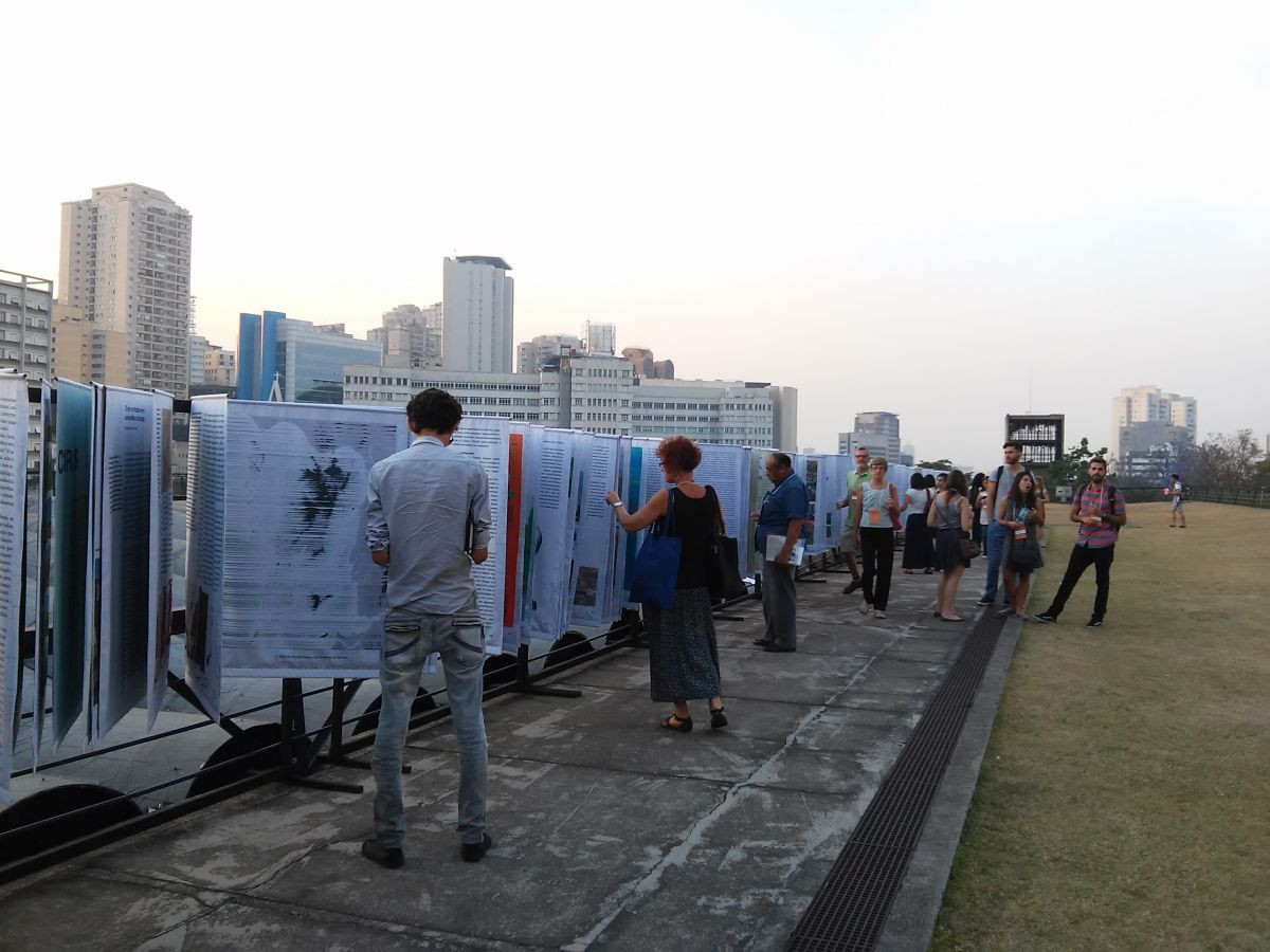 Na exposição, todas as páginas do livro Urbanismo Ecológico foram impressas em tecido, penduradas em uma estrutura de 1,70m de altura e expostas ao ar livre no jardim suspenso do Centro Cultural São Paulo.