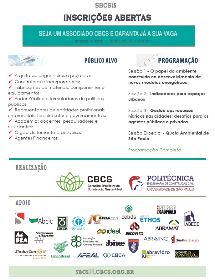 "Repensar a construção em tempos de rápidas transformações", é tema do 8º Simpósio Brasileiro de Construção Sustentável – SBCS15, a ser realizado no dia 22 de setembro de 2015, no Auditório István Jancsó, Biblioteca Brasiliana, localizado na Cidade Universitária da cidade de São Paulo.