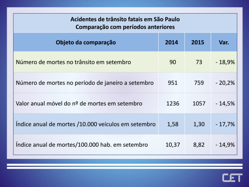 Os dados apresentados pelo levantamento mostram que as ruas ficaram mais seguras para pedestres, motociclistas, ciclistas, passageiros e motoristas. Comparando janeiro e setembro de 2014 e de 2015, a redução é de 192 vítimas fatais. Em setembro de 2015, foram registradas 73 mortes no trânsito, 18,9% a menos que no mesmo mês de 2014, quando 90 pessoas morreram em acidentes.