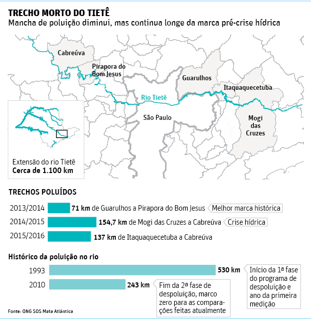 O Tietê estava "morto" por 71 km, entre as cidades de Guarulhos e Pirapora do Bom Jesus, antes da grave estiagem que atingiu São Paulo. A falta de água, que dificulta a diluição do esgoto que chega ao rio, fez mais do que dobrar a área contaminada.