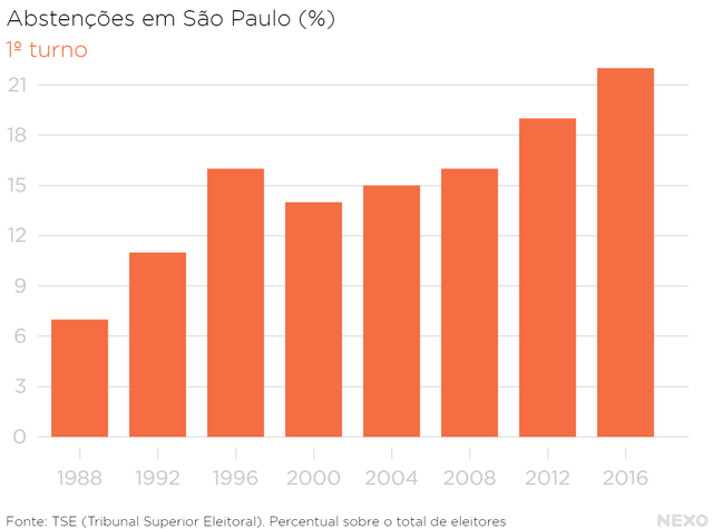 Entre as cidades em que o dado está consolidado, São Paulo mostra uma alta em relação à eleição passada. Foram 1,2 milhão de votos brancos e nulos em 2016, equivalente a 13% do universo total de eleitores paulistanos, quase três pontos percentuais a mais do que em 2012.