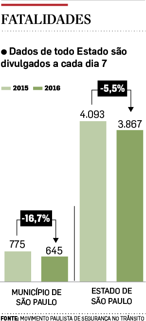 As mortes por acidente de trânsito caem na cidade de São Paulo em um porcentual três vezes maior do que no Estado, segundo dados do Sistema de Informações Gerenciais de Acidentes de Trânsito do Estado de São Paulo (Infosiga). Na capital, a queda é de 16,7%, de 775 para 645 ocorrências, de janeiro a agosto deste ano, em comparação com o mesmo período do ano passado. No Estado, levando em consideração os 645 municípios paulistas, a diminuição é de 5,5%, de 4.093 para 3.867 mortes.