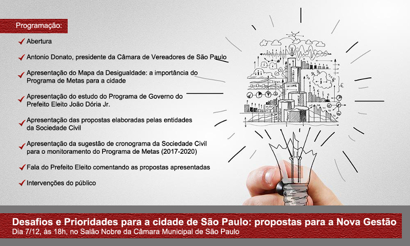Batizado de ‘Desafios e Prioridades para a cidade de São Paulo: propostas para a Nova Gestão’, encontro será realizado nesta quarta-feira (7/12), na Câmara Municipal. Participe!