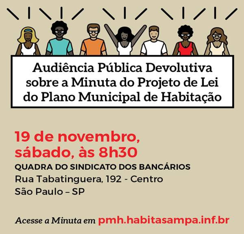 A Secretaria Municipal de Habitação convida todos a participarem da audiência pública devolutiva sobre a Minuta do Projeto de Lei do Plano Municipal de Habitação (PMH) de São Paulo.