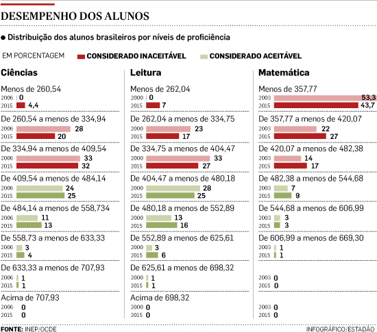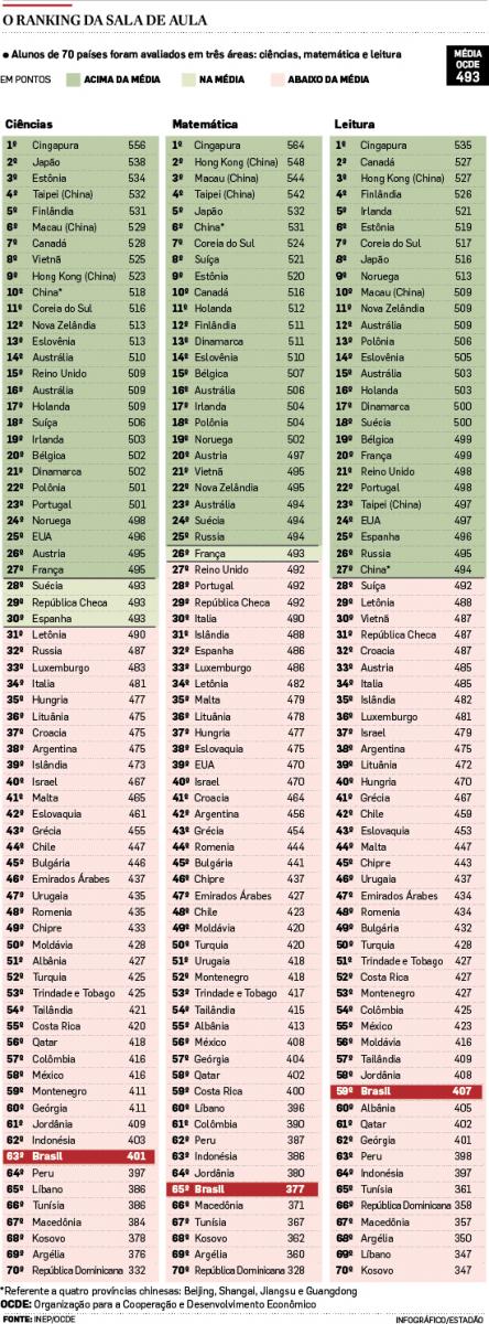 Dados são do Programa Internacional de Avaliação de Alunos (Pisa), divulgados nesta terça pela Organização para a Cooperação e Desenvolvimento Econômico