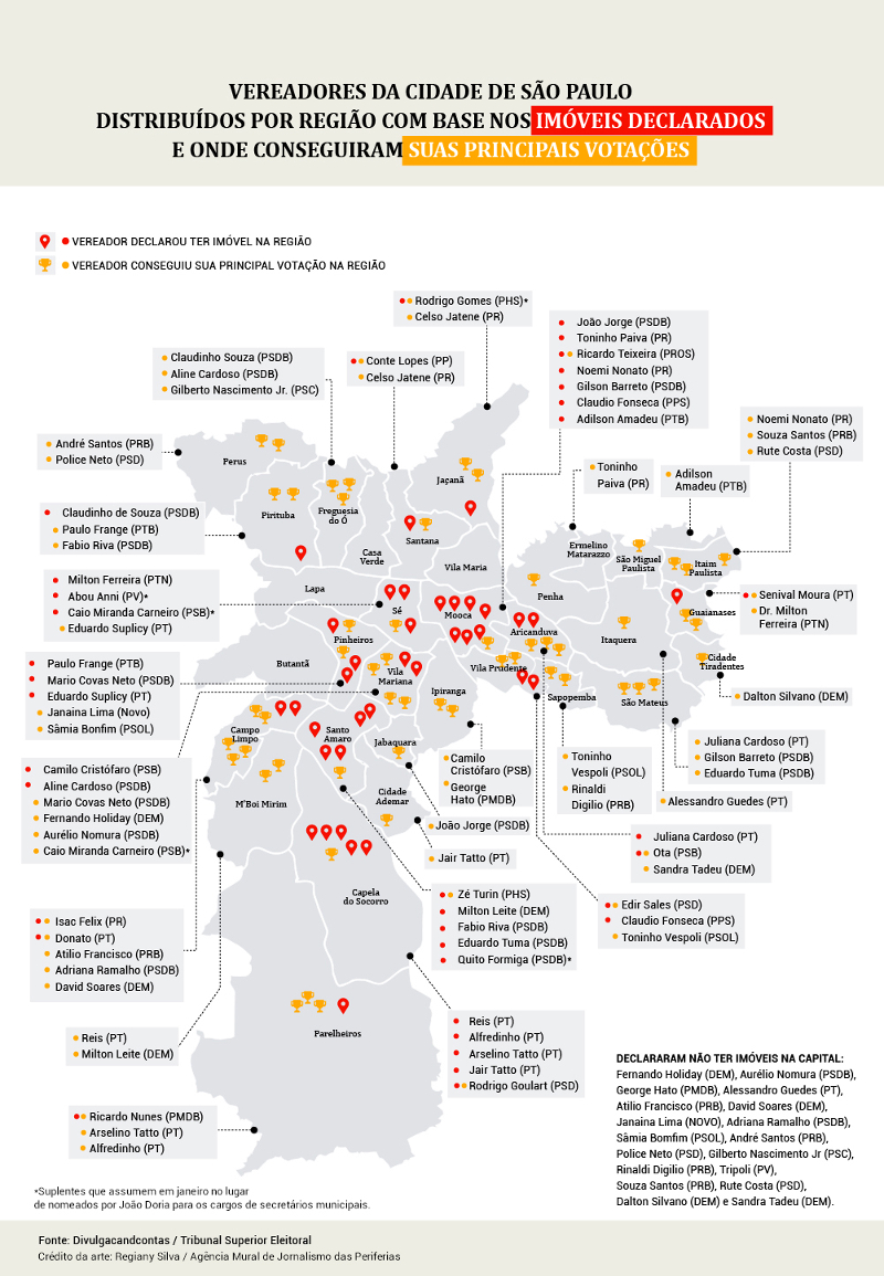 Apesar do sistema proporcional, os vereadores eleitos trazem um recorte grande de toda a cidade e quase 84% das 32 prefeituras regionais teria um representante, levando em conta os imóveis e onde tiveram as melhores votações (veja no infográfico abaixo). Por outro lado, os distritos pertencentes à Casa Verde e Vila Maria/ Vila Guilherme, na zona norte; Ermelino Matarazzo, na zona leste; e do Butantã, na zona oeste, não elegeram um parlamentar. A Lapa teria dois vereadores, mas Soninha Francine (PPS) e Daniel Annemberg (PSDB) foram nomeados para o secretariado de Doria.