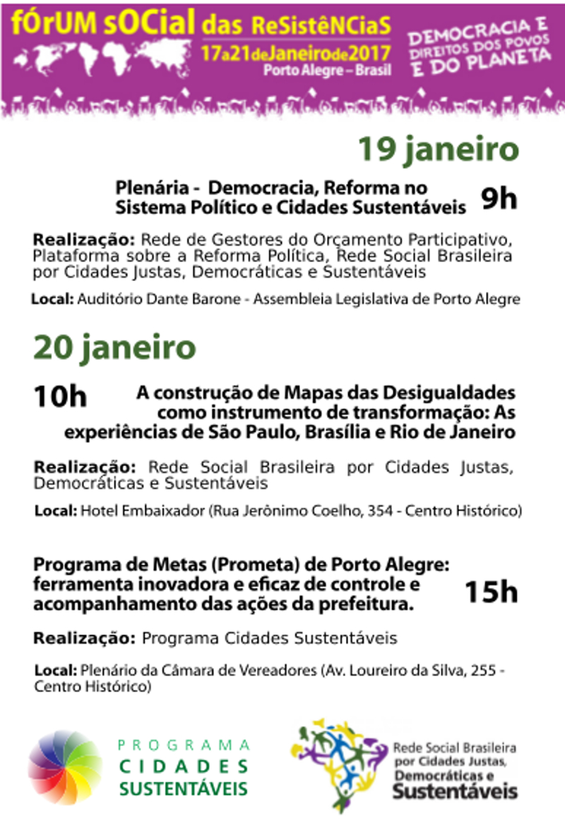 Confira abaixo as informações sobre as atividades que serão realizadas pelo Programa Cidades Sustentáveis e pela Rede Social Brasileira por Cidades Justas, Democráticas e Sustentáveis: