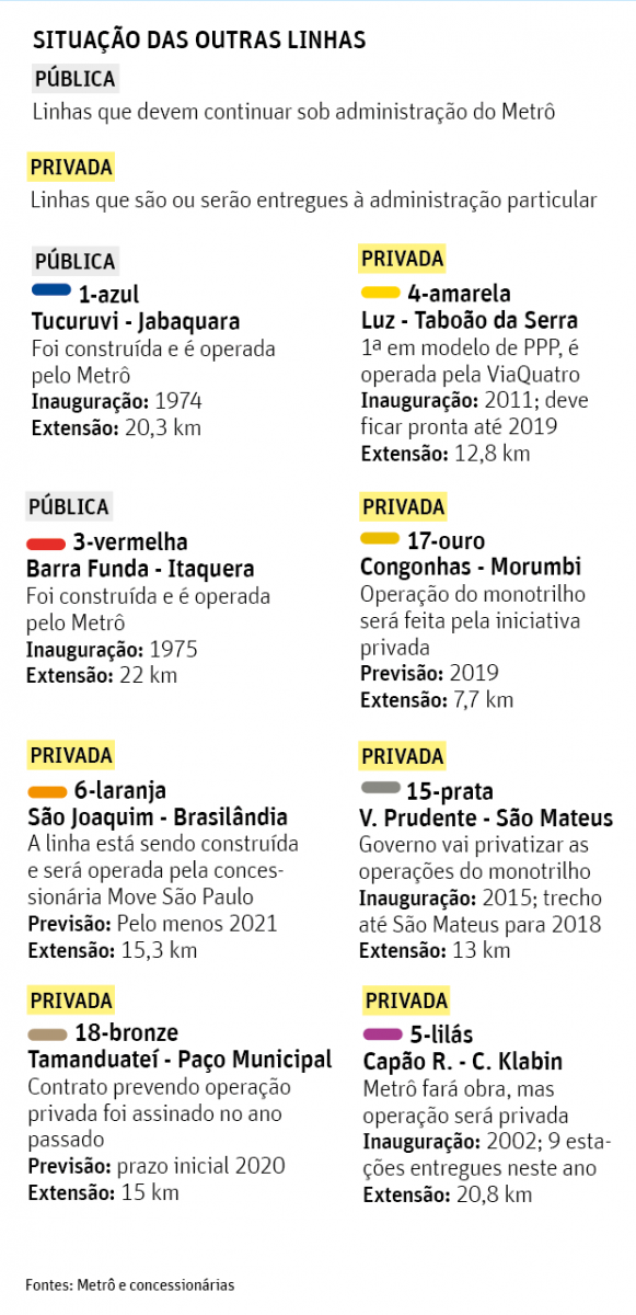 Além de conceder em conjunto as linhas 5-lilás e 17-ouro, a gestão tucana também promoverá a concessão da linha 15-prata (monotrilho da zona leste), um projeto antecipado pela Folha. Outro plano é a PPP (parceria público-privada) do monotrilho da linha 18-bronze, que fará a ligação com a região do ABC.
