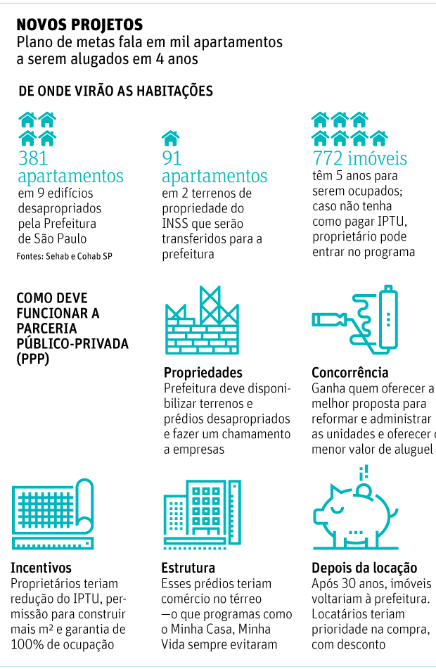 Em vez da produção da "casa própria" em conjuntos habitacionais distantes, feitos em grande escala por empreiteiras, o plano é estimular a produção de unidades subsidiadas para aluguel em áreas centrais de São Paulo.