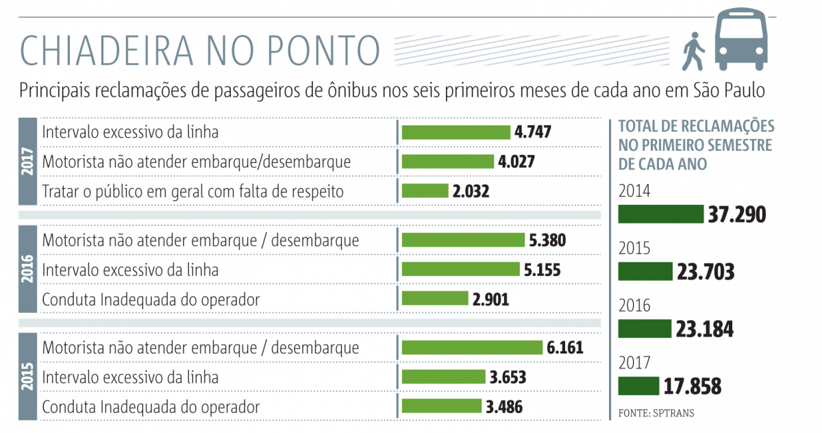 Em 2015 e 2016, o maior “vilão” dos usuários de transporte público era outro: o que os passageiros mais reclamaram naqueles dois anos foi de os motoristas não atenderem o pedido de embarque ou desembarque. Neste ano, essa queixa foi a vice-campeã do primeiro semestre, com 4.027 registros (veja dados no quadro).