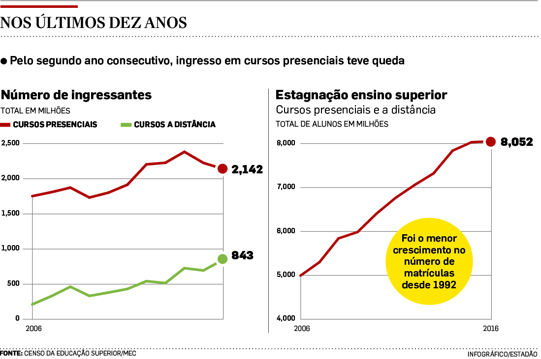 Pela primeira vez em 25 anos, o número de alunos na rede particular de ensino superior caiu no Brasil. Em 2016, as instituições privadas – que respondem por 75,3% das matrículas nessa etapa de ensino – tinham 6,05 milhões de matriculados, ou 16,5 mil estudantes a menos do que no ano anterior. A queda resultou em uma estagnação no volume de estudantes em faculdades e universidades do País.
