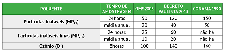No documento da OMS, intitulado “Air Quality Guidelines, an Update 2005”, o padrão de material particulado inalável (MP10) sugerido como aceitável é de 50 microgramas por metro cúbico (μg/m³) por um período de 24 horas. Pela resolução do Conama de 27 anos atrás, o padrão do Brasil é de 150 μg/m³ por 24 horas e, de acordo com o estabelecido em São Paulo, 120 μg/m³ por igual período.