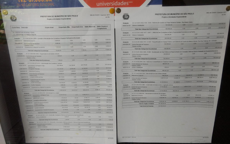 Uma situação observada durante a blitz nas sedes regionais foi que algumas delas chegam a disponibilizar a execução orçamentária, porém os dados estão desatualizados. Na Cidade Ademar, por exemplo, o relatório que está no quadro de avisos data de agosto. O caso do Butantã é ainda mais grave. A tabela de gastos está afixada em uma área restrita a funcionários, segundo uma recepcionista que trabalha no local. Além disso, os dados apresentados são de 2016. Em Santo Amaro, eles também são do ano passado.