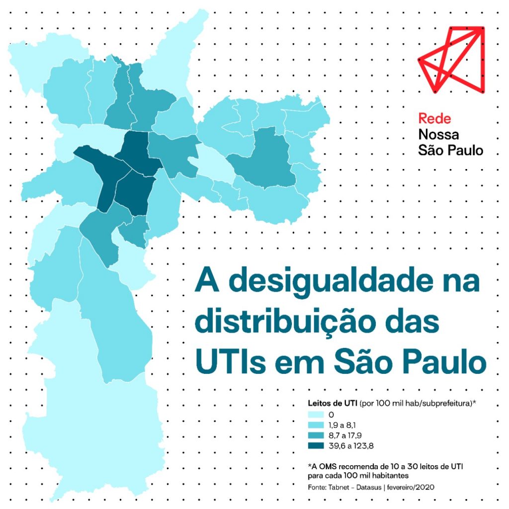Um mapeamento realizado pela Rede Nossa São Paulo, a partir de dados de fevereiro de 2020 do DATASUS, mostra a distribuição desigual dos leitos de UTI vinculados ao SUS no município, e os resultados são indicativos da exclusão vivida por cidadãos que moram nas periferias da cidade: apenas 3 subprefeituras (Sé, Pinheiros e Vila Mariana) – localizadas nas regiões mais ricas e centrais – concentram mais de 60% dos leitos em UTI do SUS no município. Enquanto isso, 20% da população (2.375.000 pessoas) vivem em 7 subprefeituras – localizadas nas periferias do município – em que não há um leito sequer.