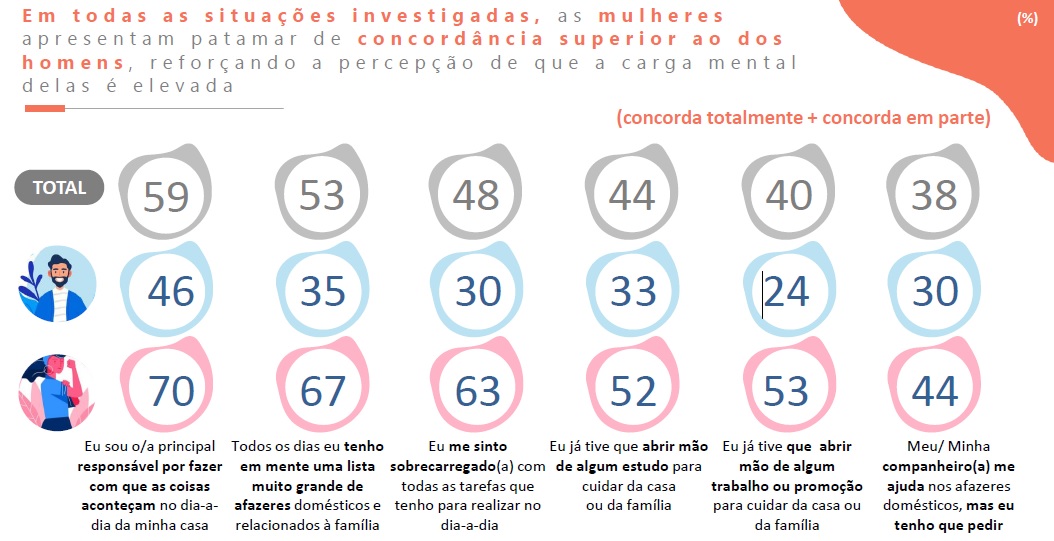Em todas as situações investigadas, as mulheres apresentam patamar de concordância superior ao dos homens, o que reforça a percepção de que a carga mental delas é elevada.