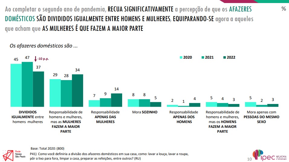 Com o avanço da retomada do trabalho presencial, nota-se um recuo na percepção de que afazeres domésticos são divididos igualmente, em comparação a 2021. Passou de 47% para 37% o número de pessoas que acreditam que a divisão acontece de forma equilibrada dentro de casa.