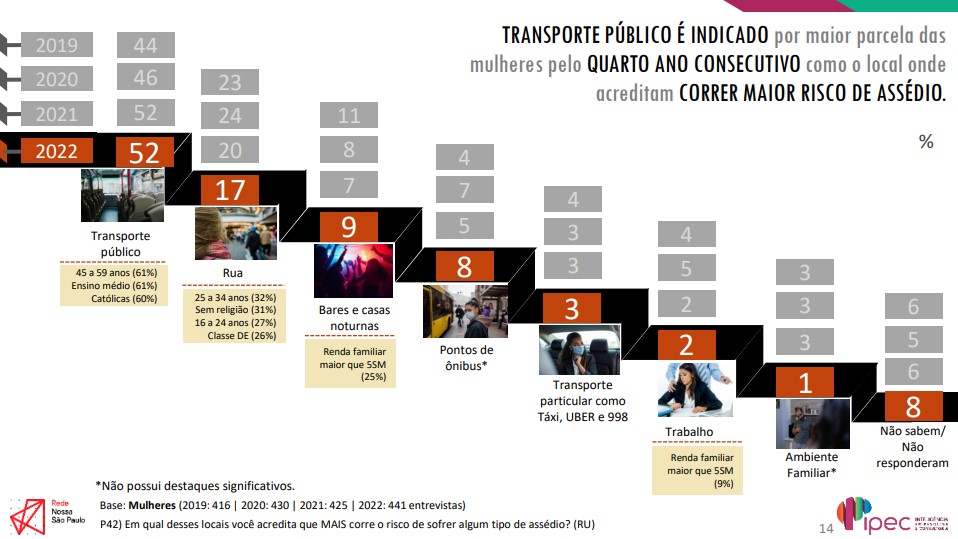 O transporte público segue como o espaço público onde as mulheres se sentem mais vulneráveis e correndo maior risco de assédio (52%), percentual que chega a 61% entre paulistanas de 45 a 59 anos e aquelas com ensino médio completo. É o quarto ano consecutivo onde o transporte aparece como maior fator de risco para as usuárias do sexo feminino, e na Região Sul o percentual chega a 59%.