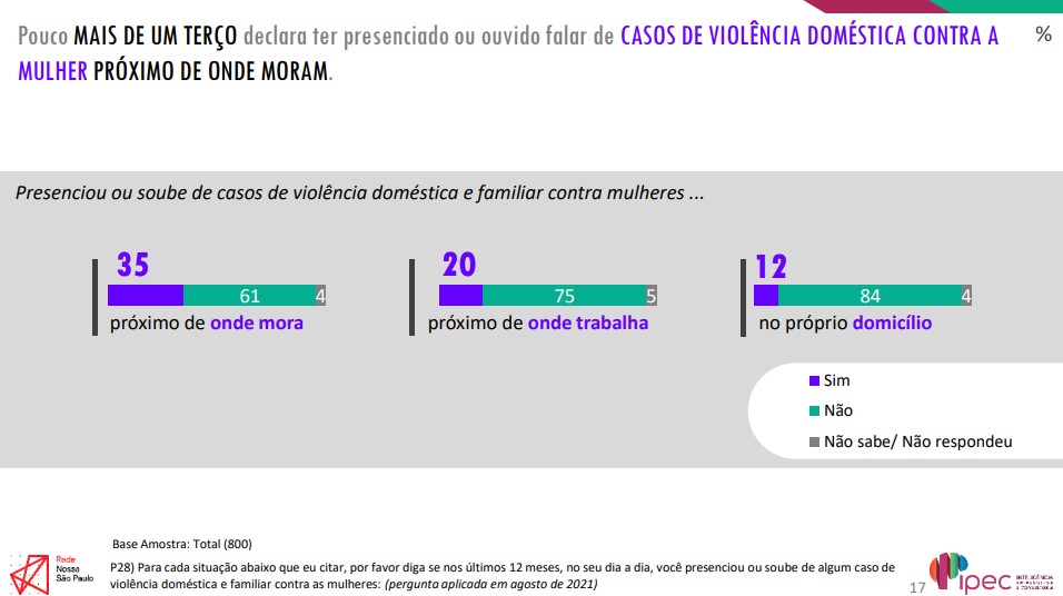 Reforçando o dado público de que a cada uma hora, 9 mulheres sofrem algum tipo de violência, 34% dos paulistanos afirmam conhecer uma amiga ou conhecida que já sofreu violência doméstica. A maioria dos entrevistados afirma ter presenciado situações nas proximidades de onde moram – sobressaindo-se a Região Sul. Também entre os paulistanos na faixa etária entre 25 e 34 anos, evangélicos e aqueles que têm Ensino Médio a percepção é mais aguçada.