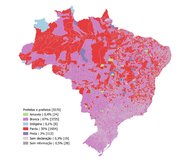 Já os recortes por região mostram que, na região Sul, 95% dos prefeitos são brancos; no Sudeste, 79%. Os pardos são a maior parte no Norte (58% dos prefeitos) e no Nordeste (49,5%).