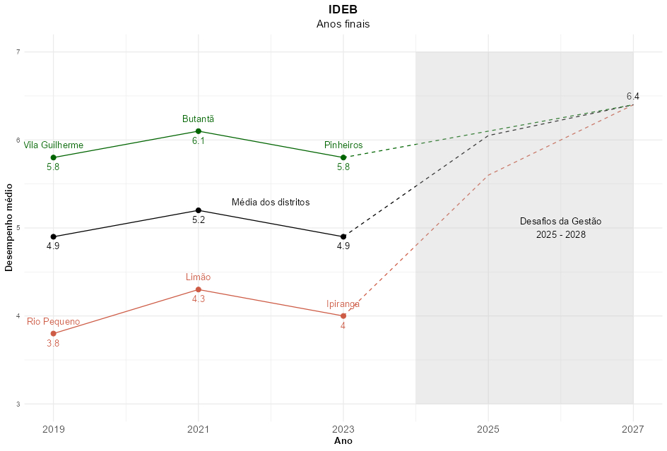 Quando comparados aos dados de 2019 (pré-pandemia), os resultados atuais estão bem abaixo dos 6,4 pontos — valor sugerido pela sociedade civil em proposta apresentada à Prefeitura para o Programa de Metas 2025-2028. No início de abril, o Executivo municipal divulgou a primeira versão do documento, estabelecendo a nota 5,0 como meta para os anos finais do ensino fundamental até 2028.