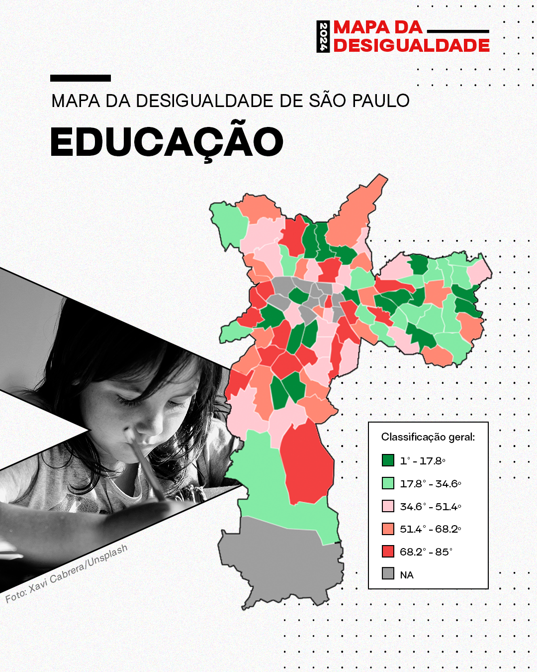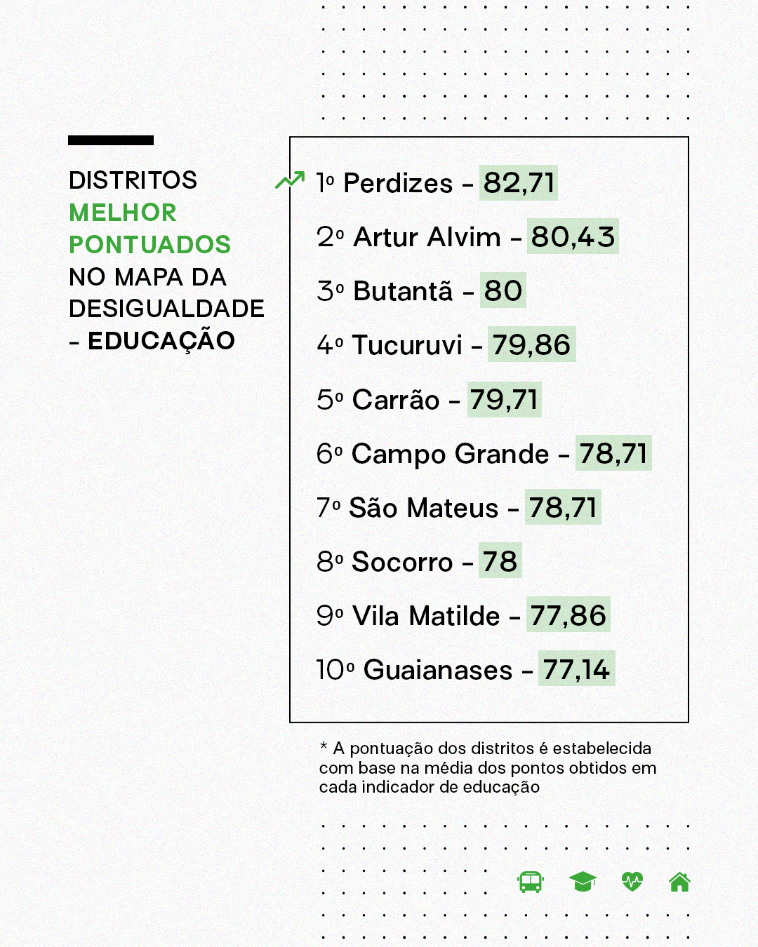 O Mapa da Desigualdade traz também o ranking temático de educação, que apresenta a classificação dos 85 entre os 96 distritos da cidade na área. A lista considera as regiões que possuem educação municipal e o desempenho de cada distrito em cada indicador, de modo que se obtenha uma pontuação geral no tema. No topo, aparecem Perdizes, Artur Alvim e Butantã. Na outra ponta, estão Sé, Campo Belo e Santana.